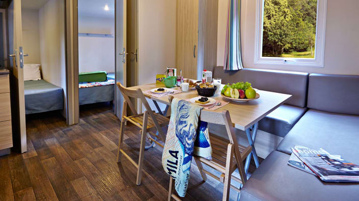 Die Unterkunft hu stay Easy XL besteht aus drei Schlafzimmern: einem Doppelzimmer mit Doppelbett, einem Doppelzimmer mit zwei Einzelbetten und einem Zimmer mit einem Etagenbett. Es gibt ein Wohnzimmer mit voll ausgestatteter Küche und zwei Badezimmer (eines mit WC, eines mit Dusche und Waschbecken). Die gemütliche Holzveranda ist mit Tisch und Stühlen ausgestattet und lädt die ganze Familie zum Entspannen ein.