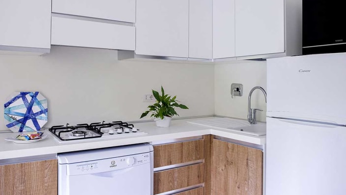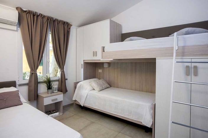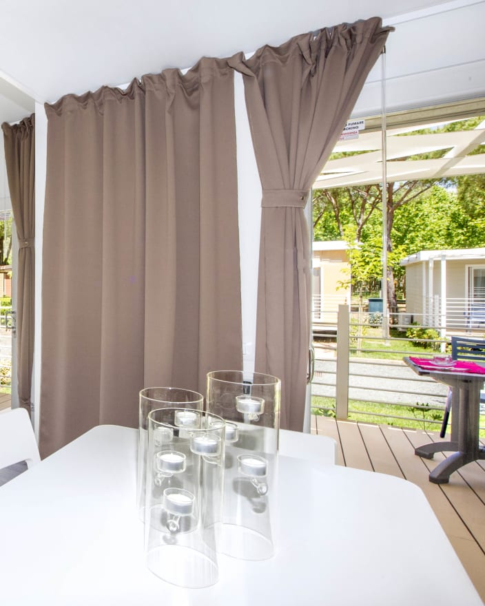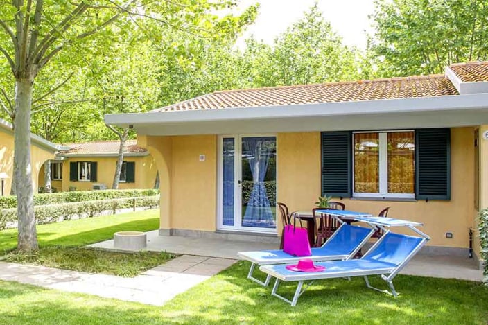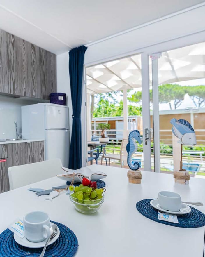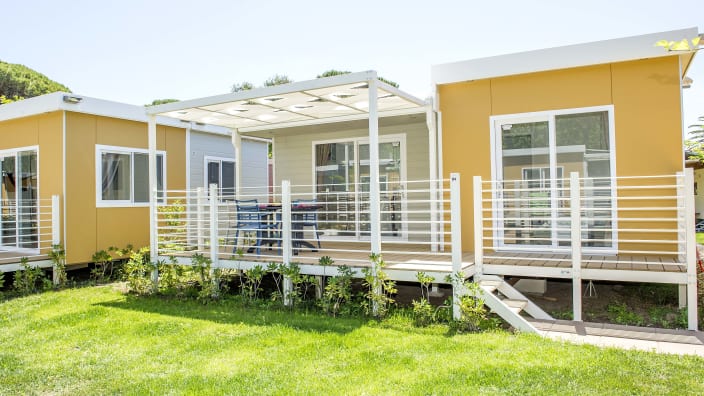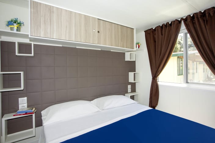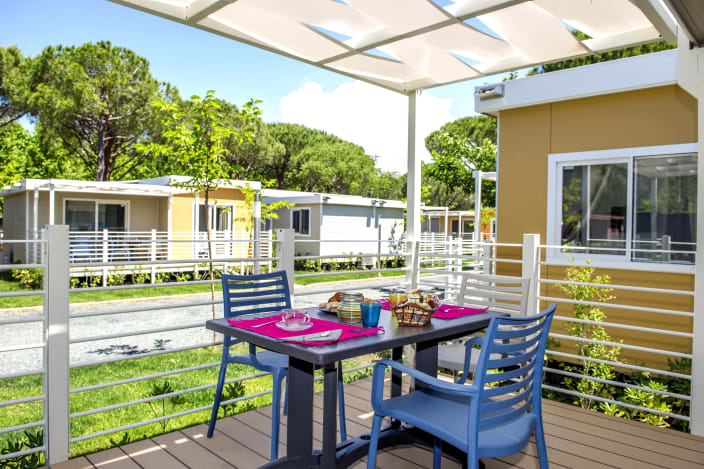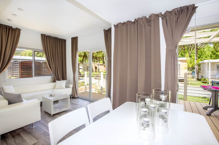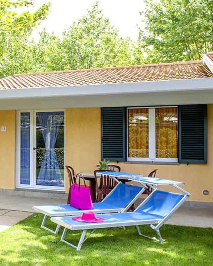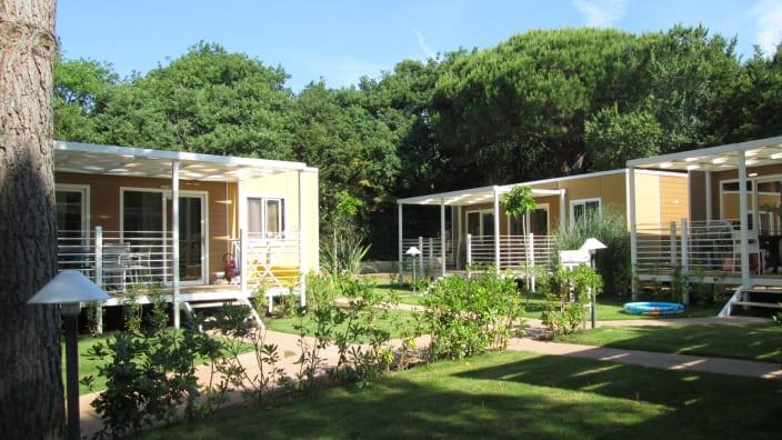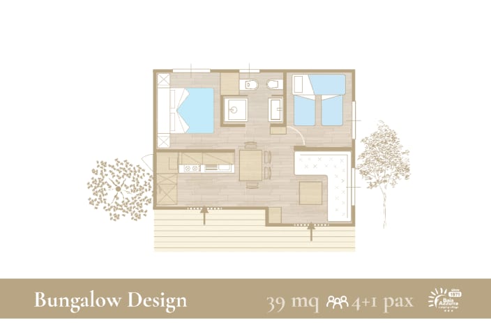 4+1 Personen / 40m² Bungalow mit modernen Dekor und harmonischen Farben. Der Innenraum besteht aus: Doppelzimmer mit eigenem Badezimmer mit WC, Bidet und Maxi-Dusche; Zweibettzimmer mit eigenem Badezimmer mit WC und Maxi-Dusche; Openspace-Wohnküche mit ausziehbarem Schlafsofa. Klimaanlage (warm/kalt), Geschirrspüler und TV. Privater Eingang mit großen Fenstern, mit Tisch und Stühlen ausgestattete Veranda, Privatgarten mit Sonnenliegen.