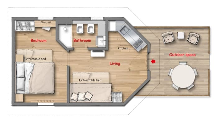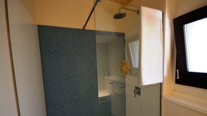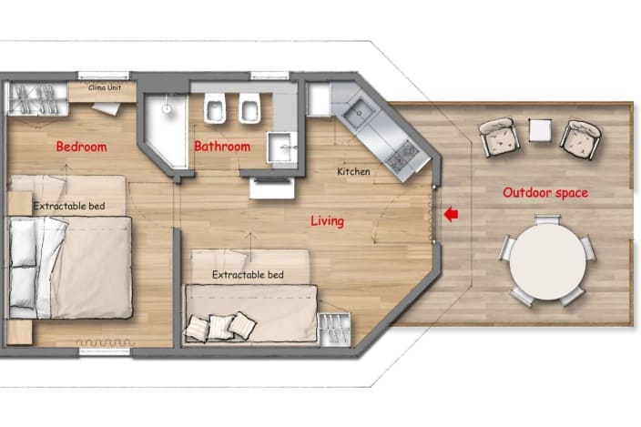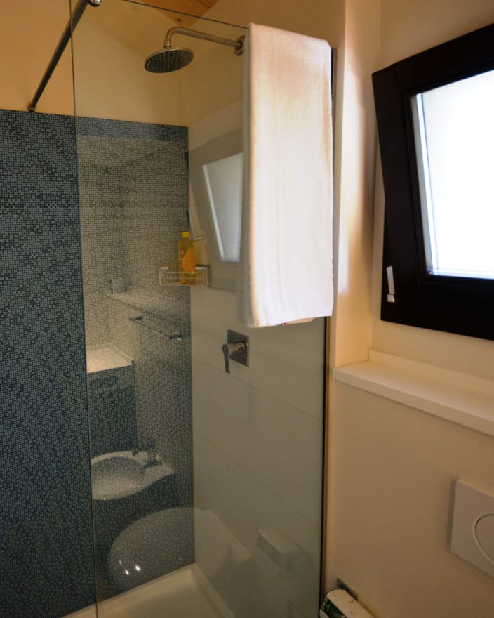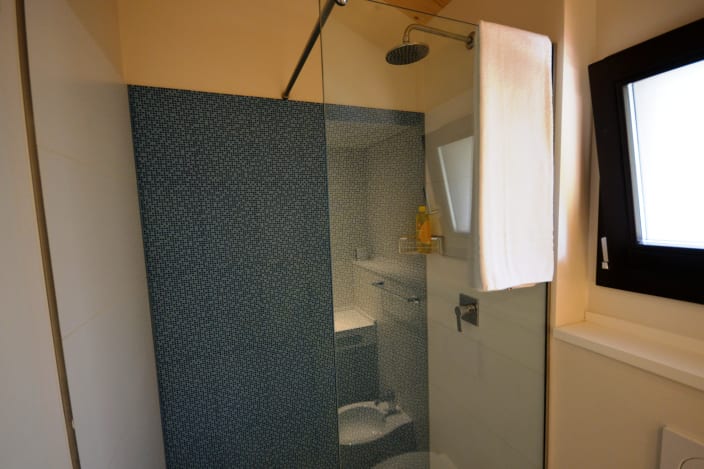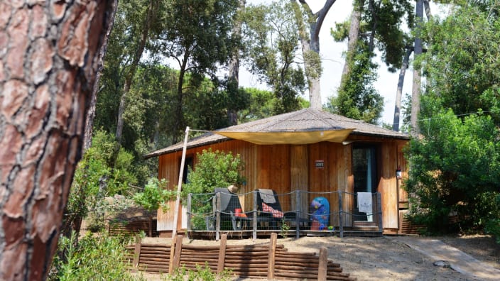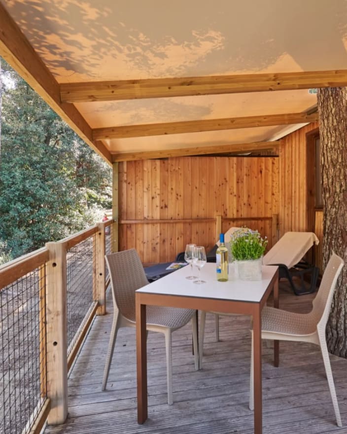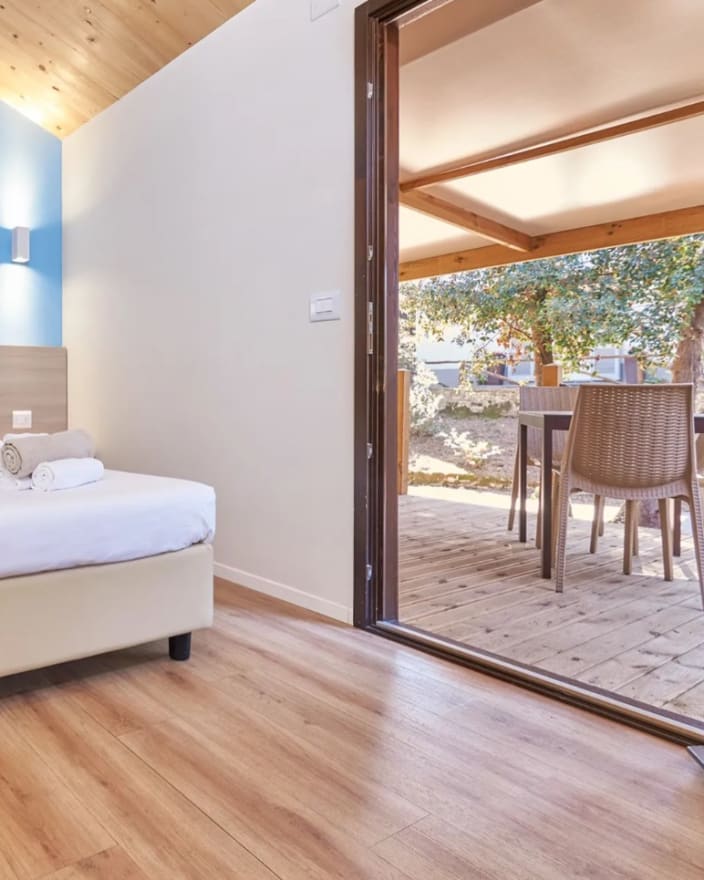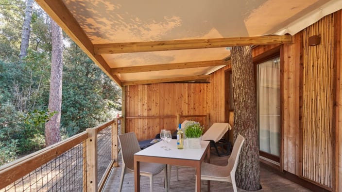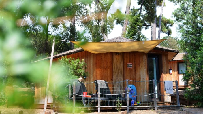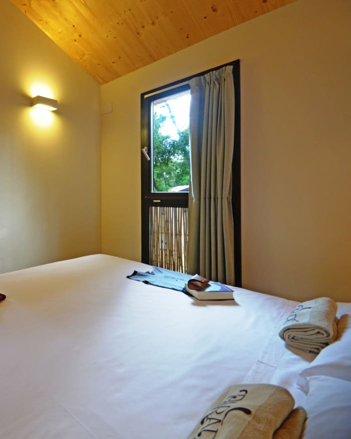 Chalet mit einer Fläche von 20 m², mit einer Terrasse, ca.15 m². Doppelbett 160x190 cm (Extrabett möglich), Kochnische mit Induktionskochfeldern und Spülbecken, Unterbau-Kühlschrank, Schrank, Schreibtisch, Fensterbad, Waschbecken mit Ablagefläche, große Dusche, WC und Bidet, Föhn, 2 Sonnenliegen und Markise, Klimaanlage/Heizung, Gas, Strom, Warm-/Kaltwasser.
