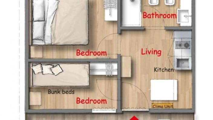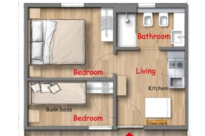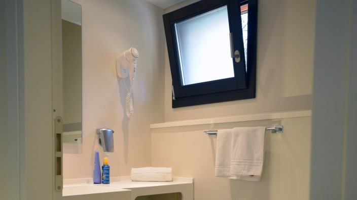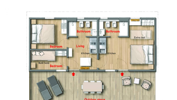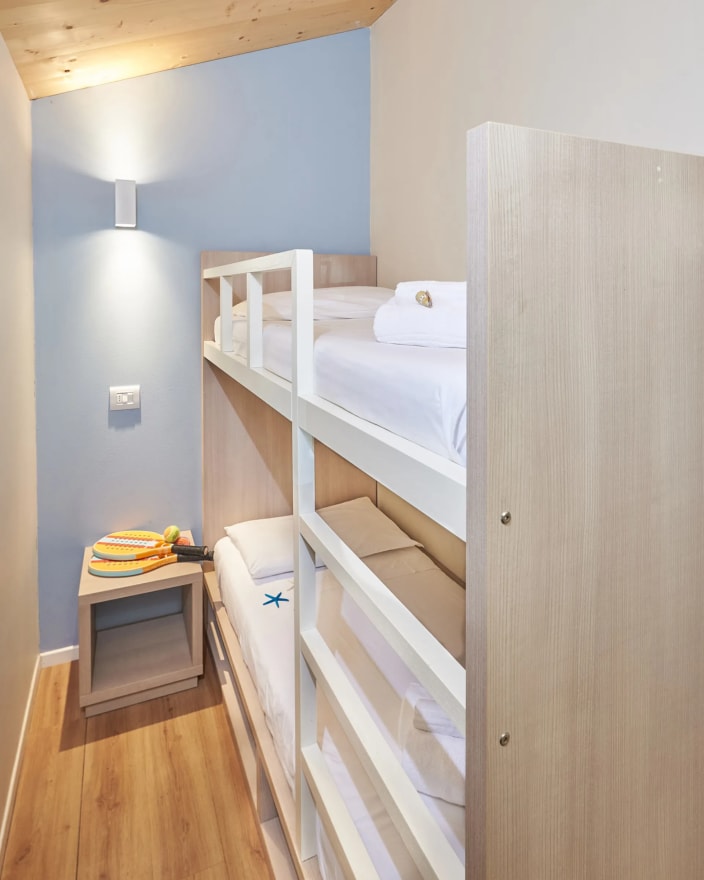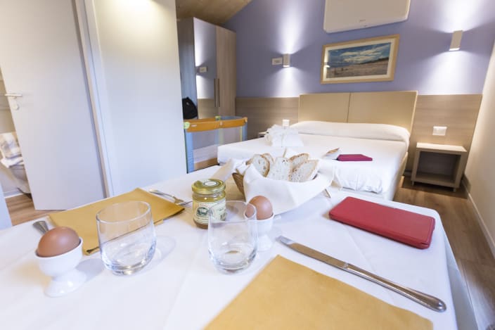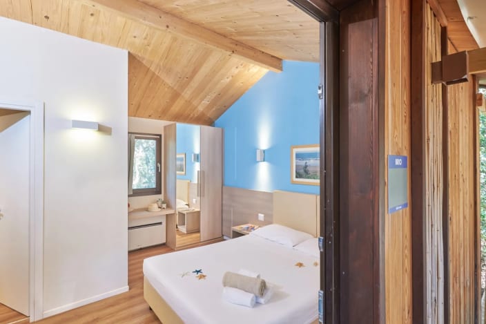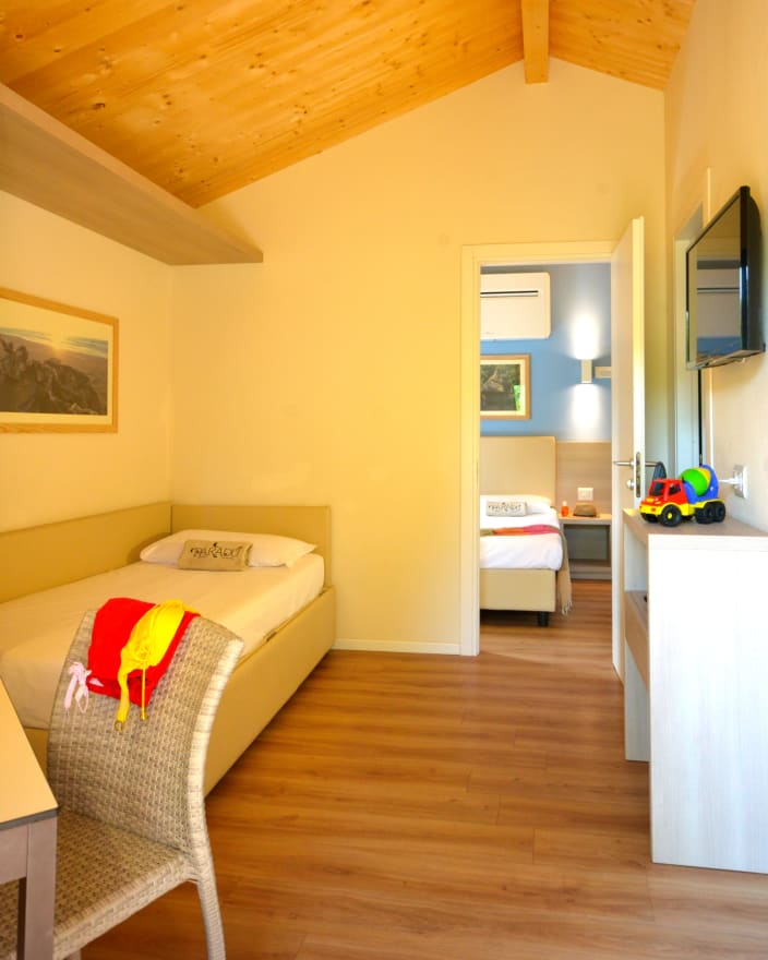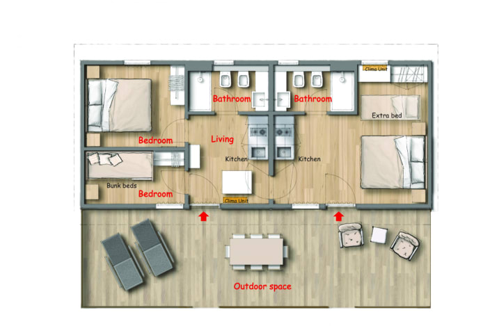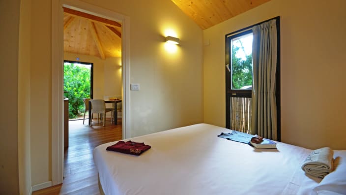 Grosses Chalet mit 42 m², mit vier Zimmern und einer Terrasse, ca. 30 m². 2 Schlafzimmer mit Doppelbett 160x190 cm (im grösseren Zimmer Extrabett möglich), 1 Schlafzimmer mit Etagenbett 80x190cm pro Bett, 2 Kochnische mit Induktionskochfeldern und Spülbecken, Unterbaukühlschrank, Schränke, Schreibtisch, Fensterbad, Waschbecken mit Ablagefläche, große Dusche, WC und Bidet, Föhn, Terrasse mit 4 Sonnenliegen und Markise, Klimaanlage/Heizung, Gas, Strom, Warm-/Kaltwasser.