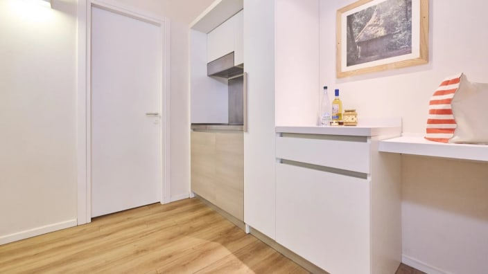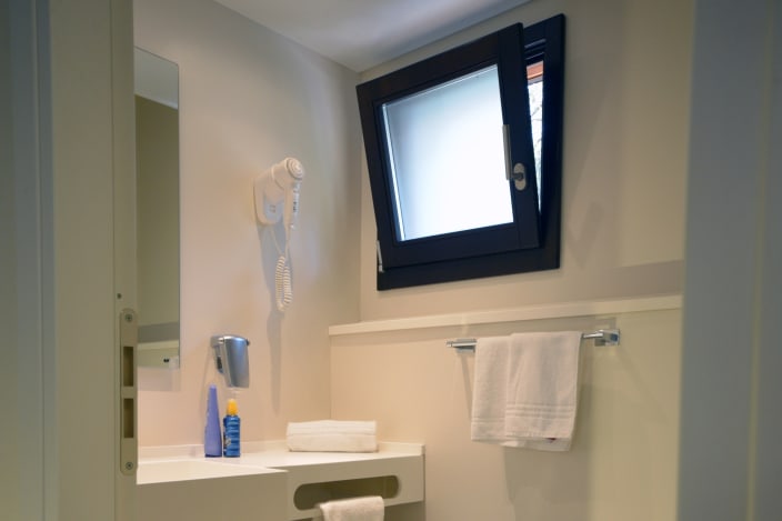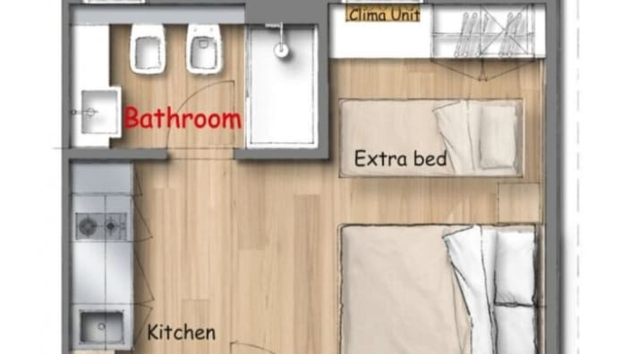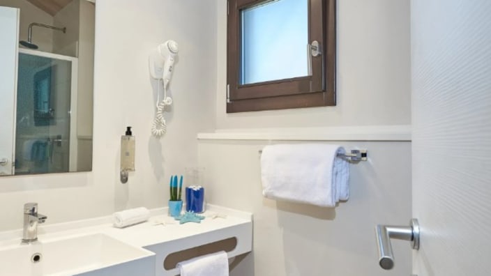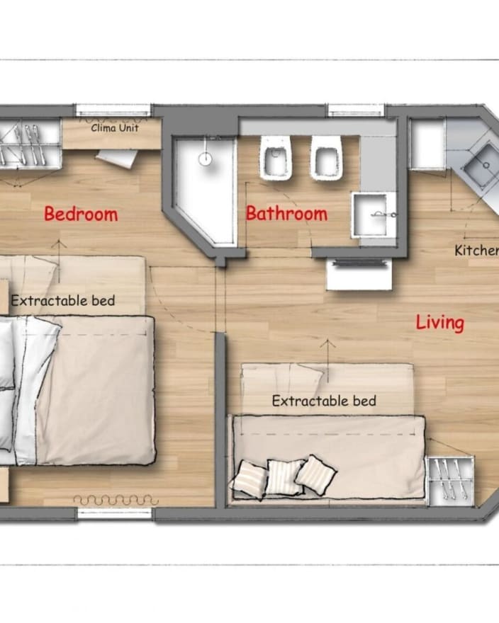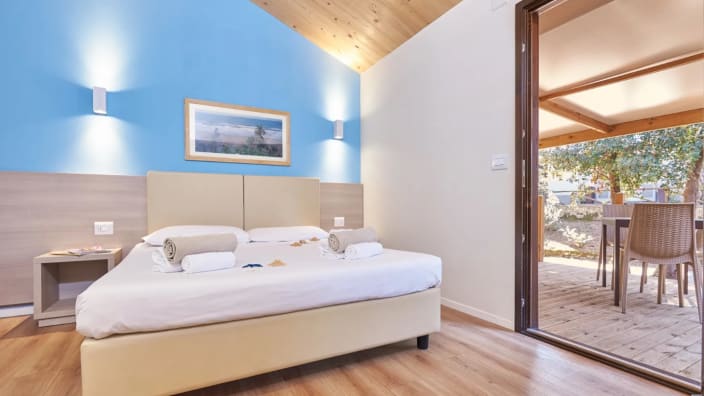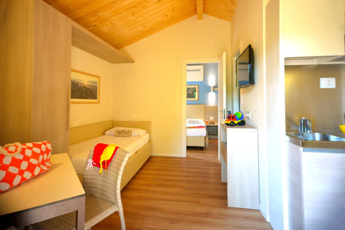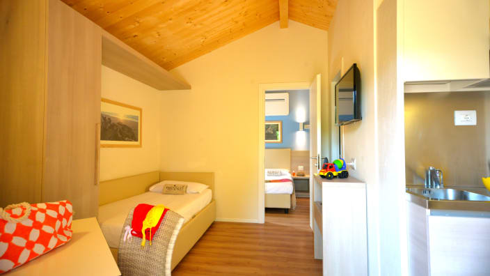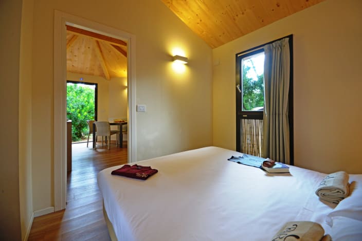 Zwei-Raum-Chalet mit einer Fläche von 27 m², mit einer Terrasse ca.18 m² (mit Gartenmöbeln ausgestattet). Ein Zimmer mit Doppelbett 160x190 cm (Extrabett möglich), Wohnraum mit ausziehbarem Bettsofa, Kochnische mit Induktionskochfeldern und Spülbecken, Unterbau-Kühlschrank, Schrank, Schreibtisch, Fensterbad, Waschbecken mit Ablagefläche, große Dusche, WC und Bidet, Föhn, Klimaanlage/Heizung, Gas, Strom, Warm-/Kaltwasser.