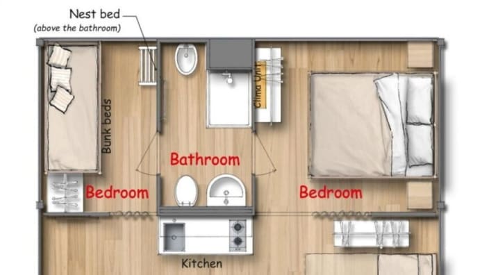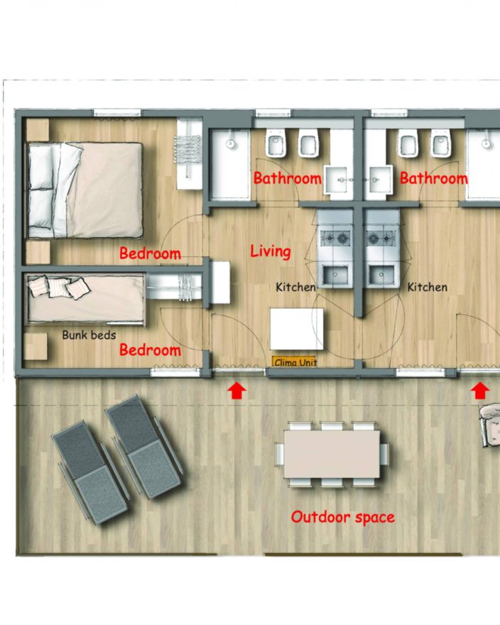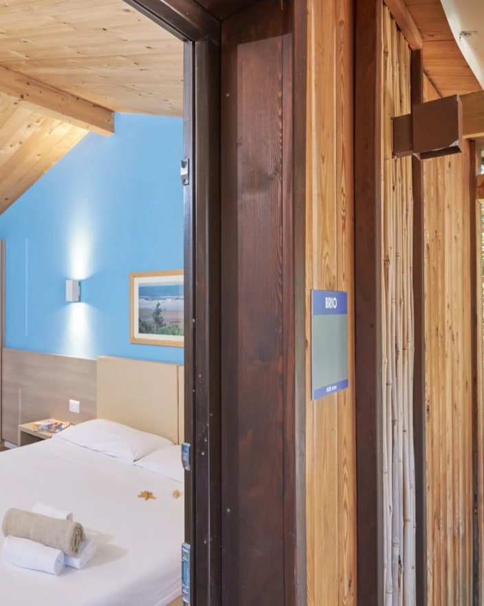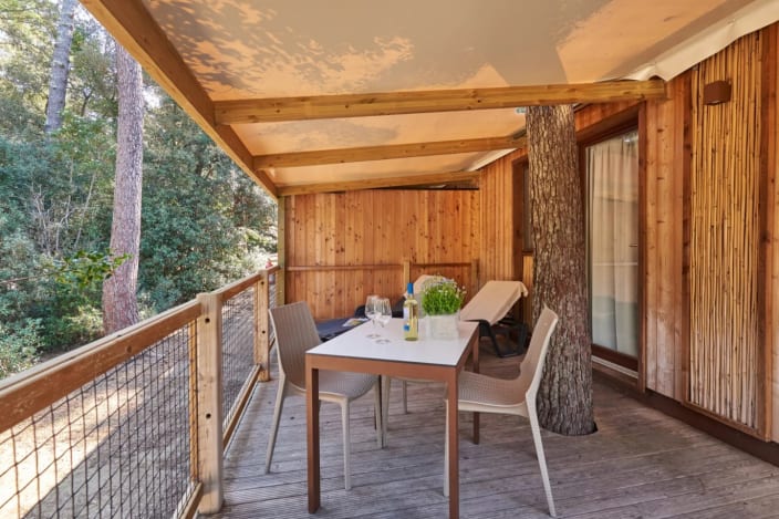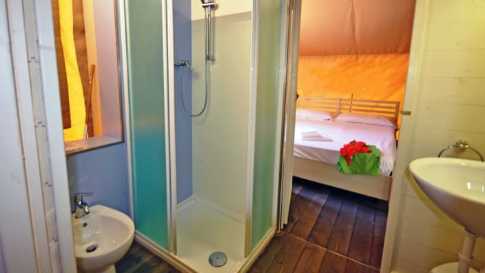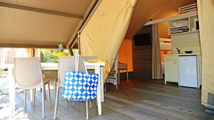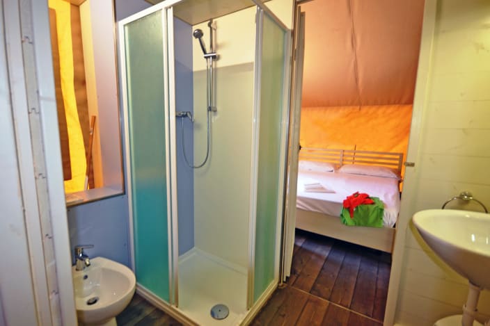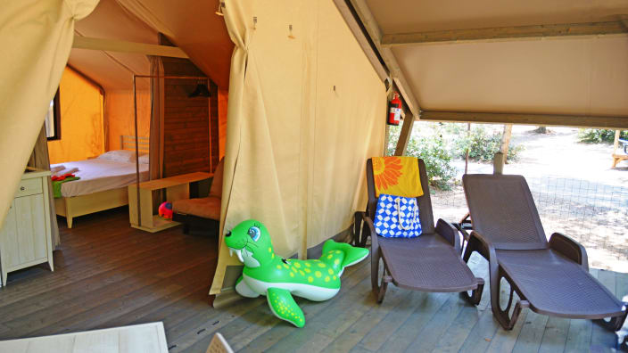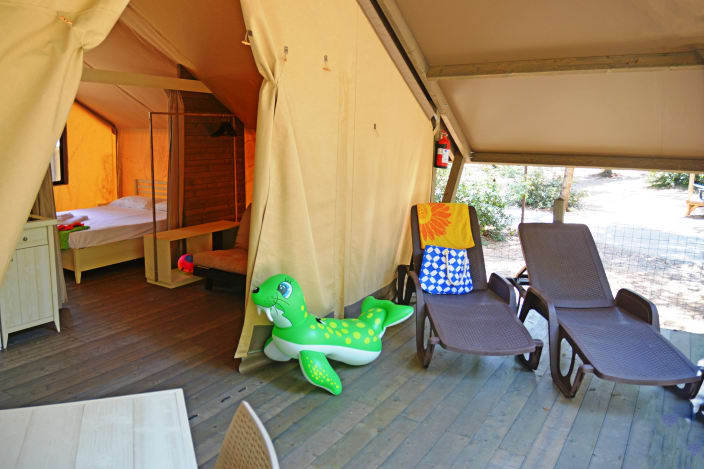 Ein Lodgezelt (48 m2) kann bis zu sieben Personen (6 Erwachsene + 1 Kind bis 11 jahre alt) unterbringen und besteht aus: ein Schlafzimmer mit Doppelbett, ein Schlafzimmer mit Etagenbett und ein Kinderbett in der Nische über dem Badezimmer, privates Badezimmer mit Dusche und ein großes Wohnbereich mit Kochnische und ein Futon-Schlafsofa, 1 Kochnische mit Induktionskochfeldern und Spülbecken, Unterbau-Kühlschrank, Fensterbad, Waschbecken mit Ablagefläche, grosse Dusche, WC und Bidet, Föhn, grosse überdachte Terrasse ca. 20 m2 und 2 Liegestühle