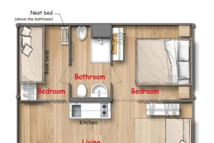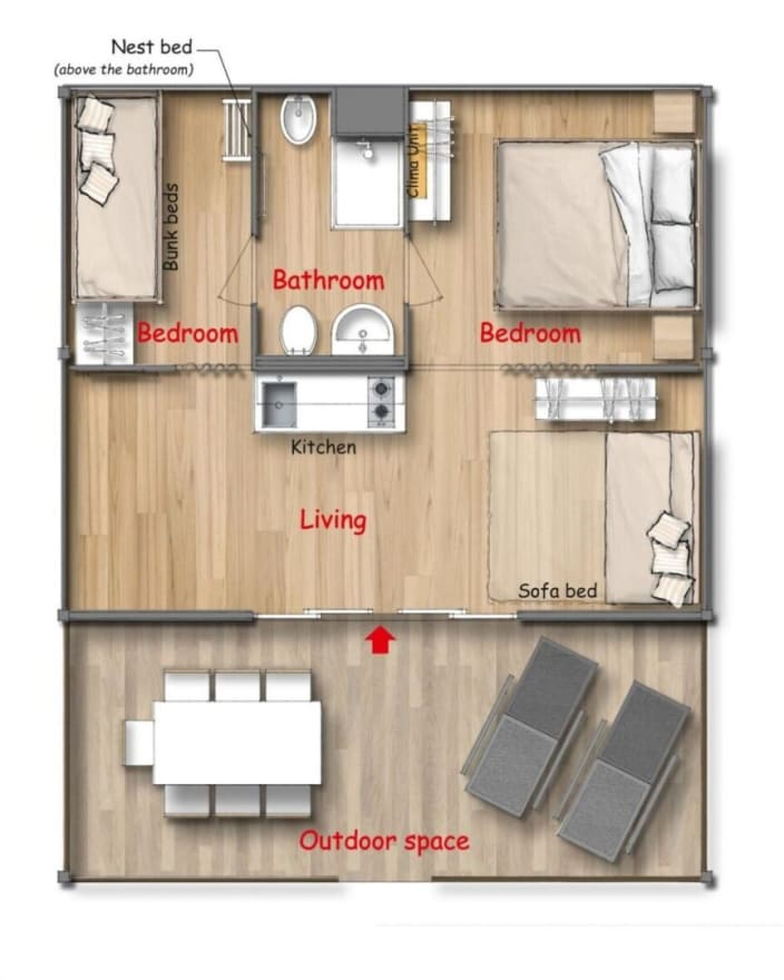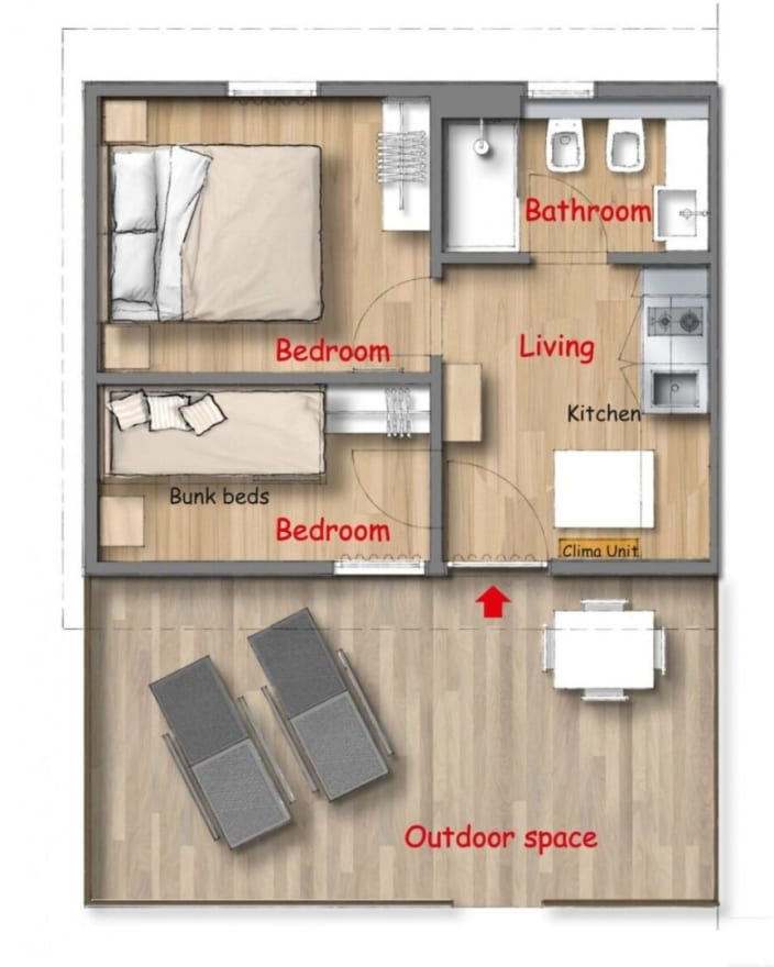 Drei-Raum-Chalet mit 22 m² Wohnfläche bestehend aus 2 Schlafzimmer: 1 mit Doppelbett 160x190 cm, 1 mit Etagenbett (80x190 cm pro Bett), Kochnische mit Induktionskochfeldern und Spülbecken, Unterbau-Kühlschrank, Garderobenständer und Fensterbad, Waschbecken mit Ablagefläche, große Dusche, WC und Bidet, Föhn, Terrasse (ca.15 m²) mit 2 Sonnenliegen und Markise, Klimaanlage/Heizung, Gas, Strom, Warm-/Kaltwasser.