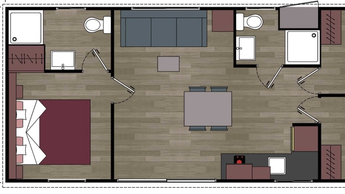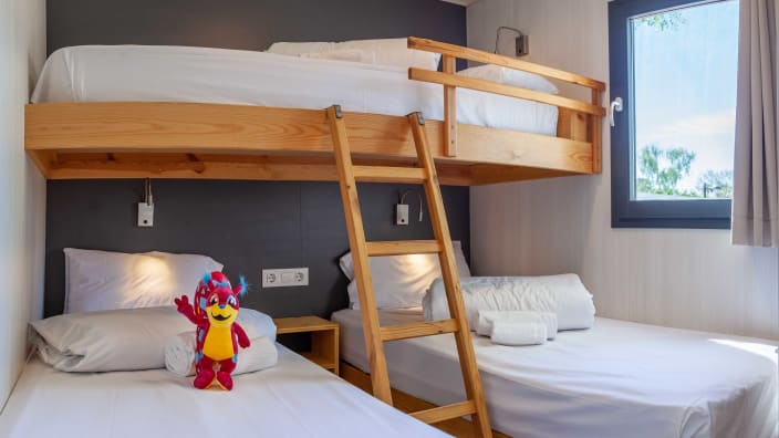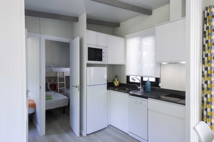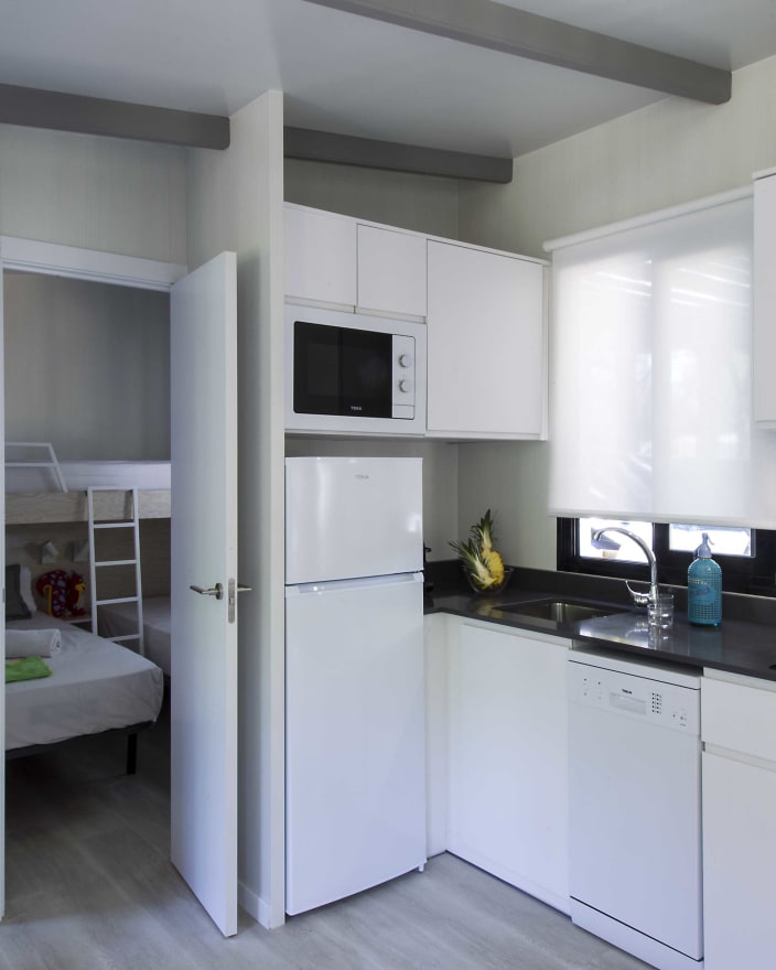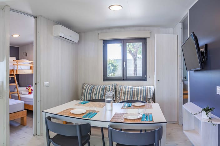 Bungalow mit zwei Schlafzimmern und einem Badezimmer. Ein Doppelzimmer mit einem Französischen Bett und ein Zimmer mit zwei Einzelbetten sowie ein Hochbett. Ein geräumiges Esszimmer mit Sessel, Couchtischchen und Fernseher, Klimaanlage und Terrasse. Voll ausgestattete, hochwertige Küche mit einem grossen Kühlschrank, Ceran-Kochfeld, Spühlmaschine und Mikrowelle.